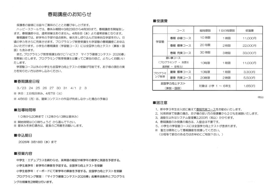 3月23日(月)~4月3日(金)の期間、春期講座を実施いたします。