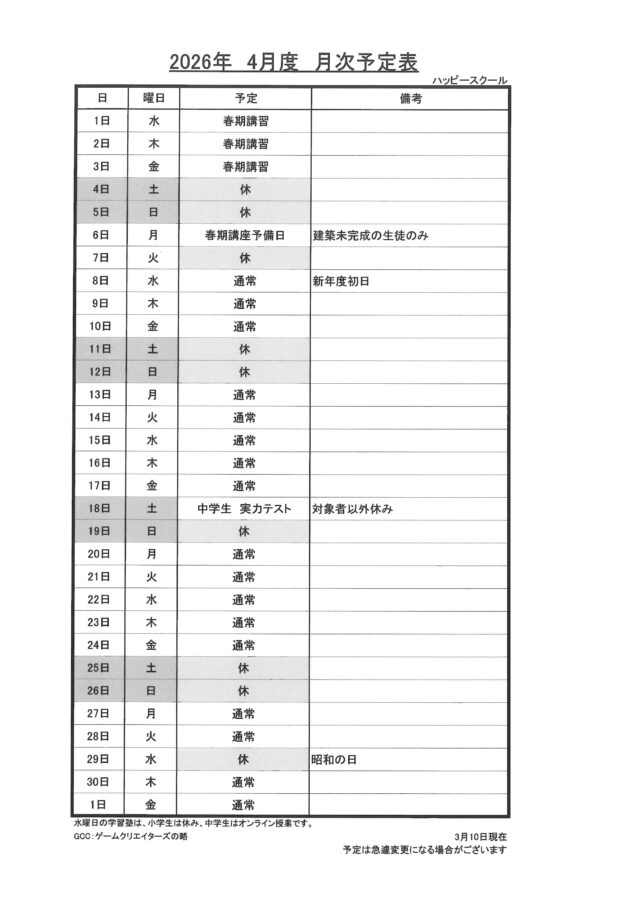 4月 月次予定